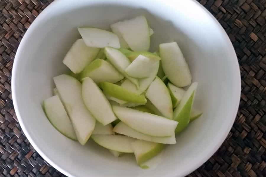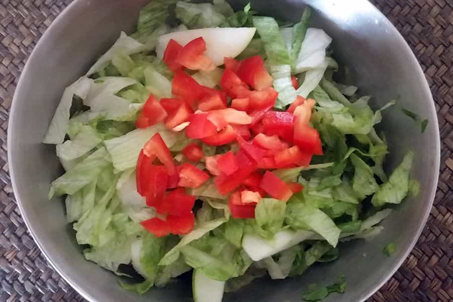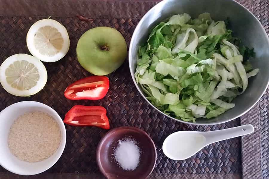 Luego, en un recipiente ubica la lechuga picada y agrega la manzana.