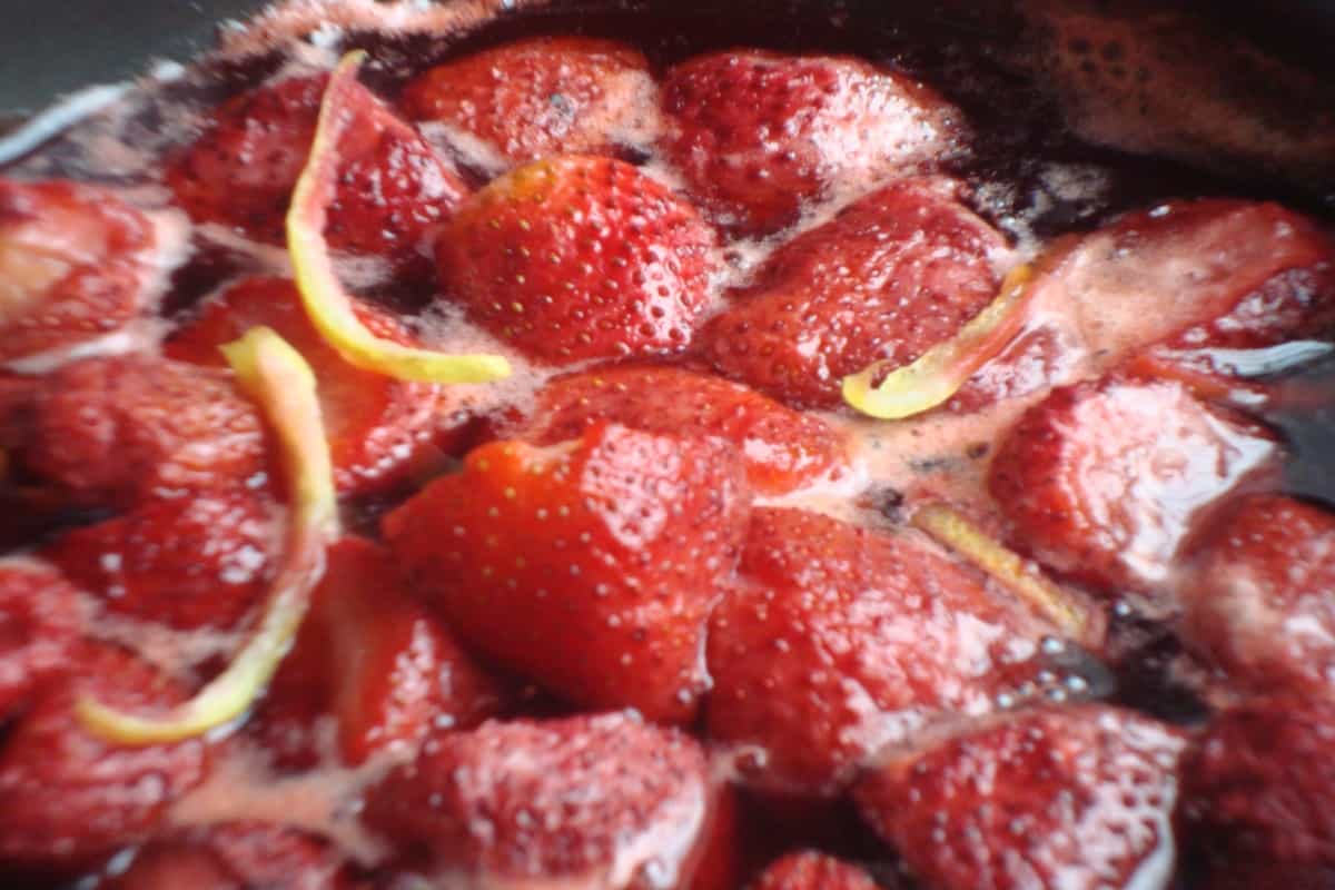 En una olla, cocinar las frutillas partidas por la mitad. Añadir la cáscara de limón y el azúcar. Cocinar a fuego medio por 10 minutos. Apagar y dejar enfriar.