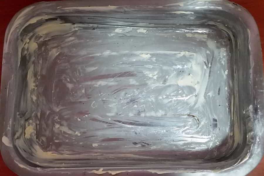 El primer paso es enmantequillar una fuente (metálica o de vidrio) por toda la superficie y bordes. Una vez que esté bien cubierta, agregamos la cucharada de aceite y la distribuimos con el ajo. ¡Sí! Usaremos el ajo como una especie de cobertor, que nos permitirá esparcir el aceite por toda la fuente.
