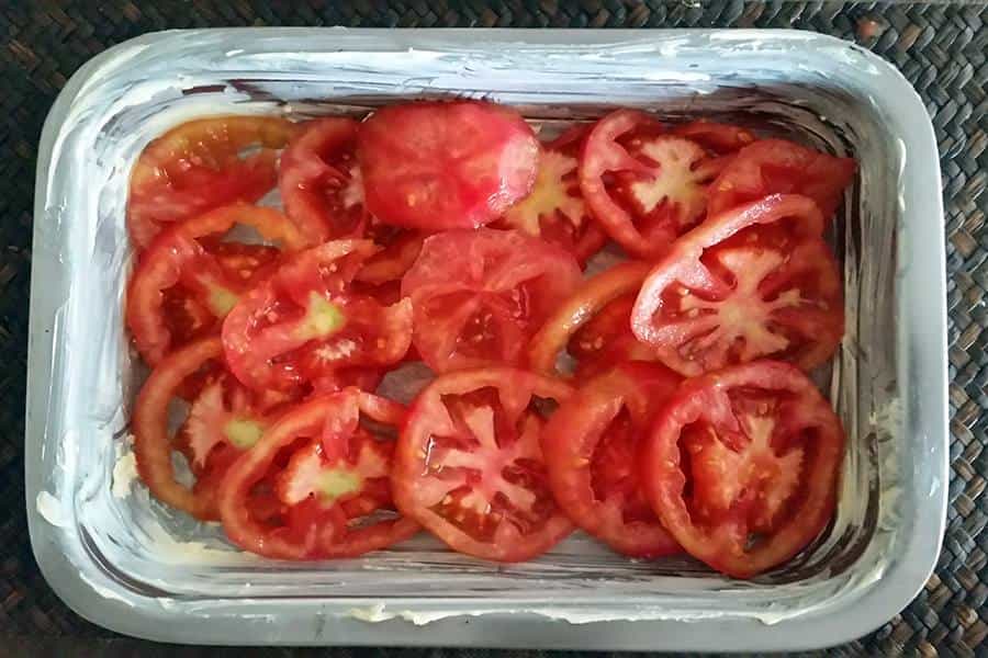 Ahora sobre la fuente, haz una primera capa de tomates. En algunos lugares puedes poner más de uno si es necesario.
