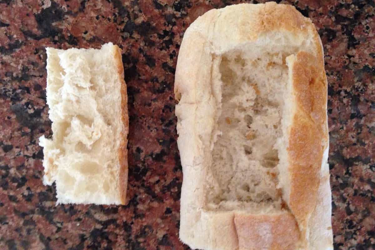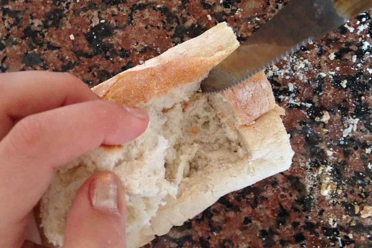 El primer paso es el más importante. Puedes hacer un bote con todo el pan baguette o, como lo hice yo, cortar un pedazo del pan. Con un cuchillo deberás hacer un rectángulo en el centro, no tan profundo, no tiene que ser un hoyo. Debe quedar pan en el fondo, para que no se nos escapen los ingredientes que queremos ponerle encima. El baguette lo puedes encontrar en cualquier supermercado por no más de $600.
