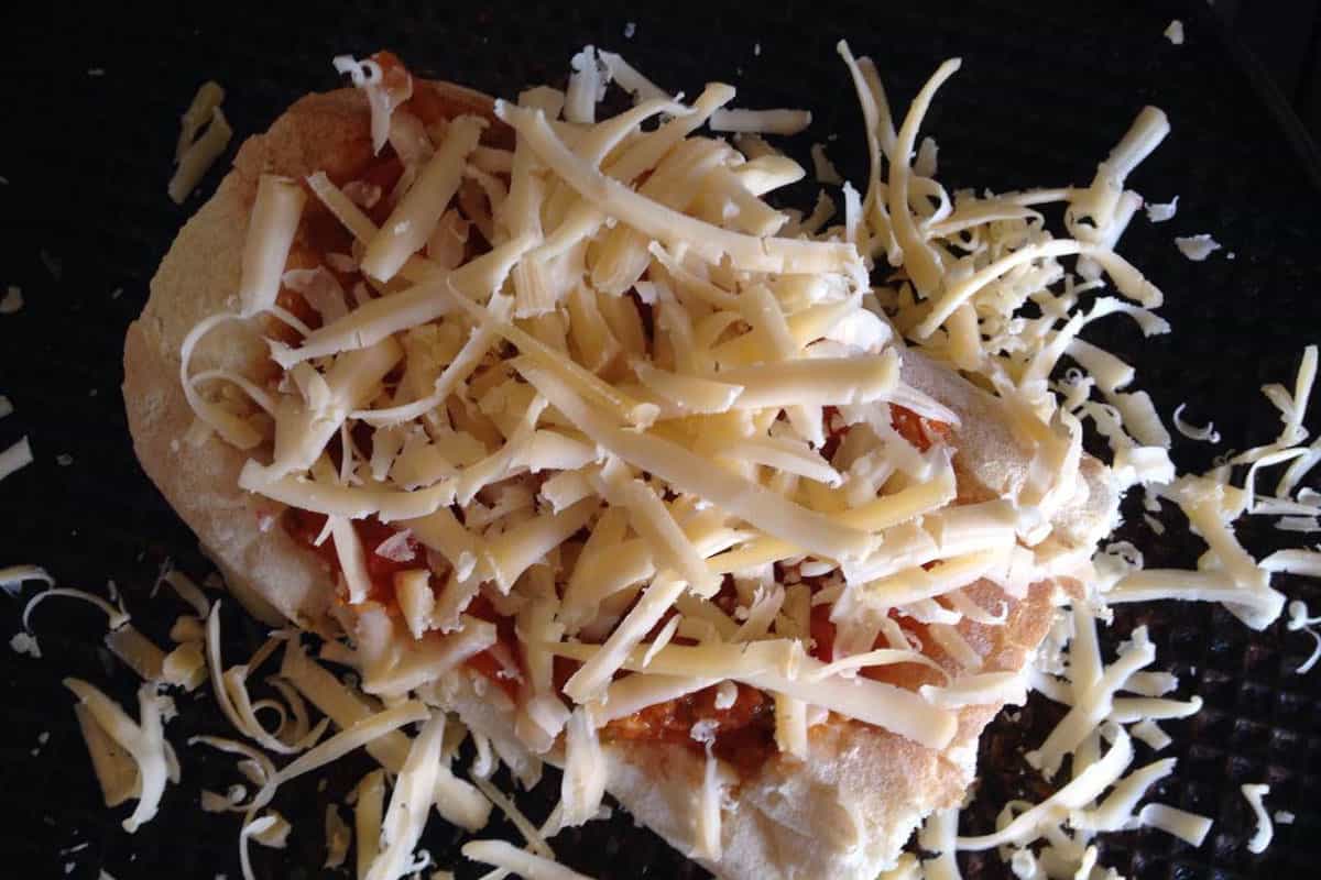 Mi parte favorita de la pizza es el queso. Rallarás el queso encima del bote. Mucho queso; lo ideal es que cubra el pan. Así evitarás nuevamente que quede reseca tu pizza. La meterás al horno por no más de 20 minutos. El pan debe quedar crocante.