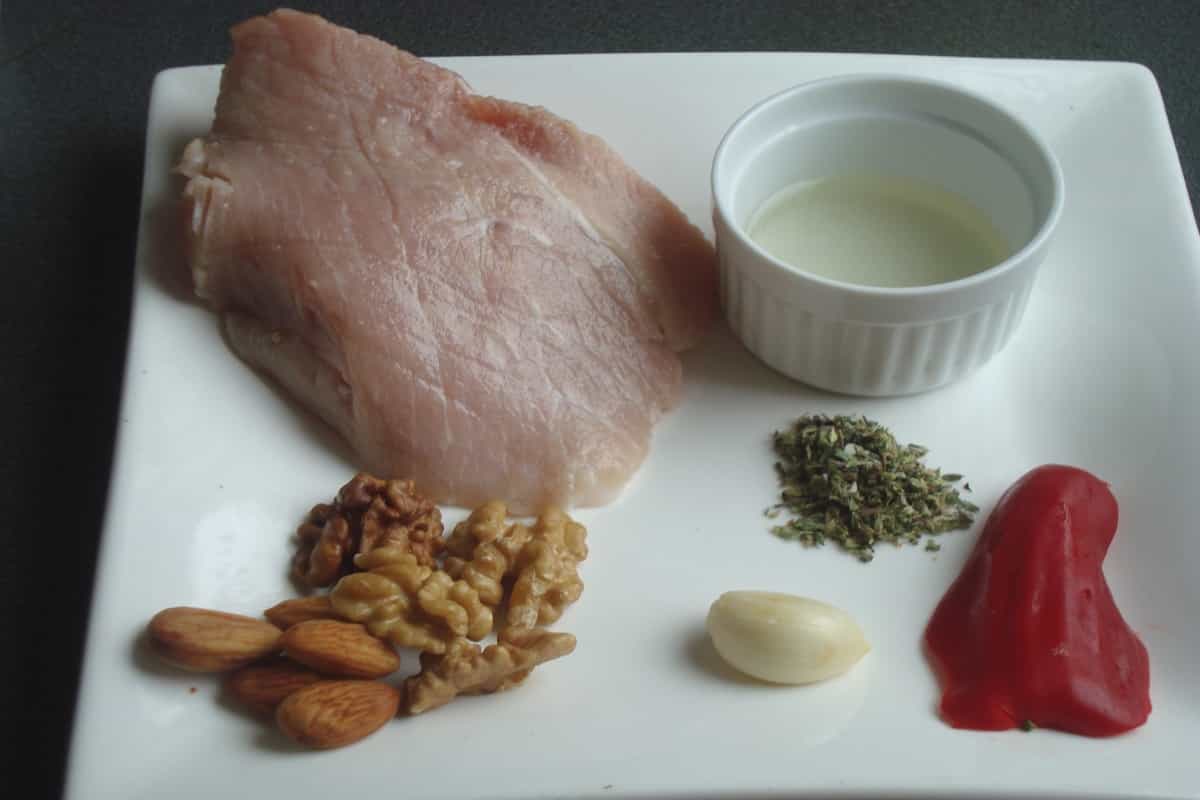Rectificar la sazón y seguir la cocción por 20 minutos. Transcurrido el tiempo de cocción, retirar la carne y cortarla en trozos. Para obtener una salsa cremosa verter los pimentones y los frutos secos con su jugo en una procesadora y triturar hasta obtener la consistencia deseada, devolver la crema a la olla o sartén y distribuir los trozos de cerdo sobre ella. Otra opción es dejar los pimentones y los frutos secos de manera rústica, para que al momento de servir se noten sobre la carne.