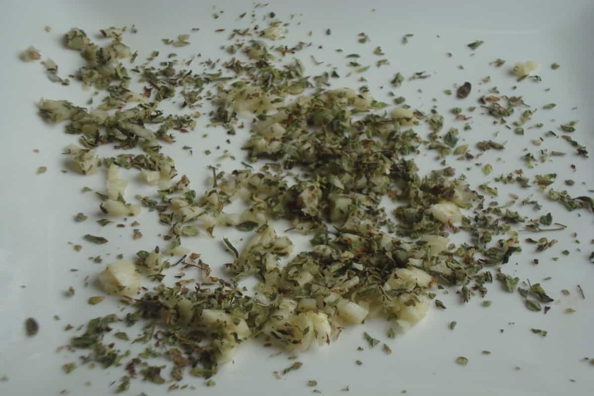 En un plato o pocillo, mezclar ajo picado finamente, orégano y sal a gusto.
