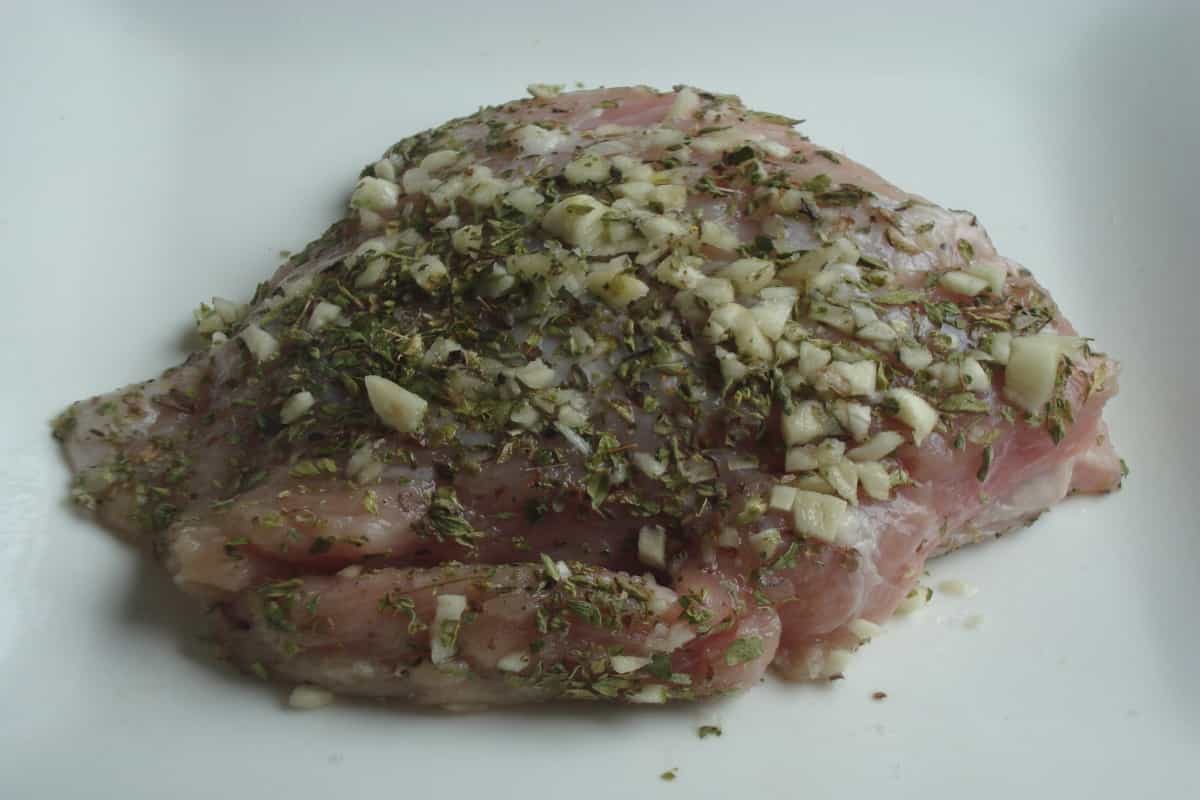 Impregnar con esta preparación el cerdo, presionando para que se adhiera bien.