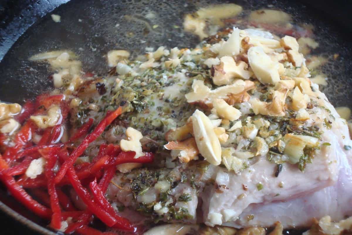 En una olla o un sartén con 3 cucharadas de aceite caliente, sellar el cerdo. Para esto cocinarlo por 3 a 4 minutos por lado. Cuando la costra de orégano y ajo se haya dorado, agregar el pimentón cortado en tiras y el vino blanco. Cocinar a fuego medio hasta que el vino se haya evaporado. Añadir los frutos secos picados y un poco de agua.