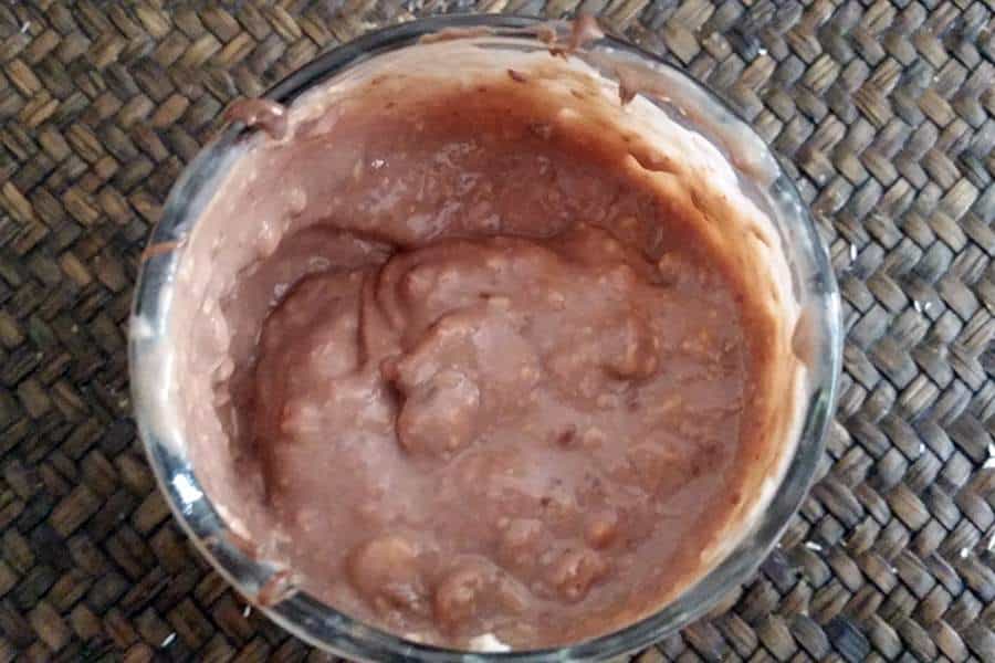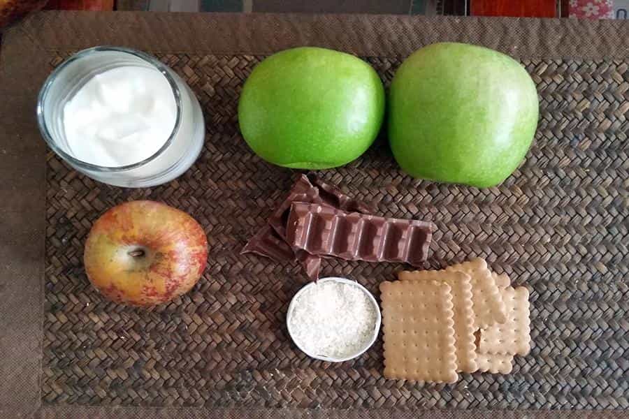 Ahora mezcla el yogurt con la manzana rallada, las galletas y la mitad del chocolate derretido. Revuelve hasta que te quede una crema. Agrega un poquito de coco.