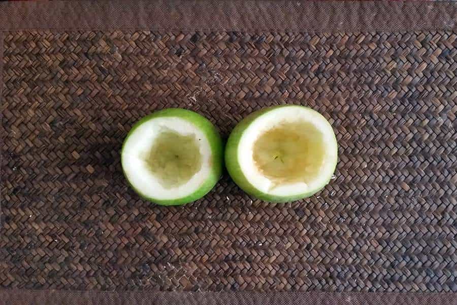 A continuación viene la parte más difícil de la preparación: cortar las manzanas por dentro. Para esto te recomendamos usar un cuchillo lo bastante fino como para cortar por todo el contorno interno de la fruta y luego sustraer el corazón de la manzana con una cuchara.