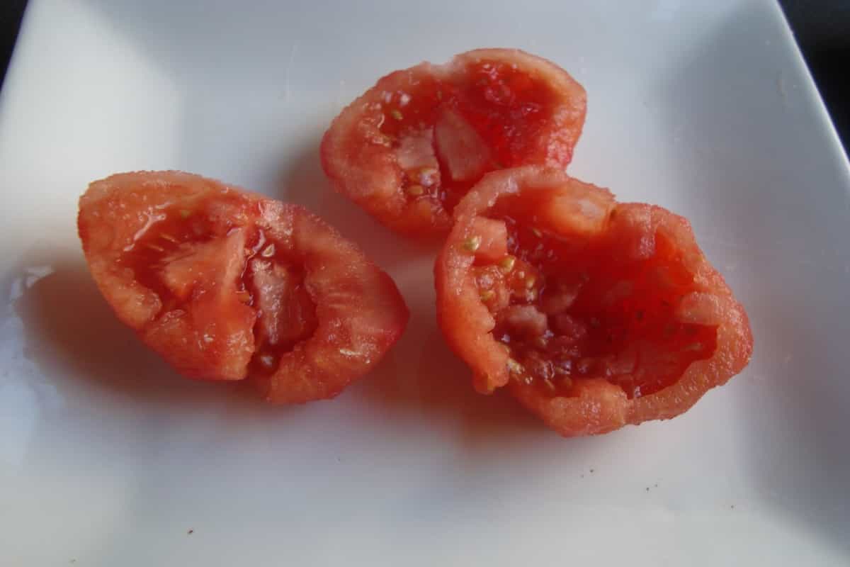 Lavar los tomates (puedes pelarlos), cortarles la parte superior (reservar) y con ayuda de una cuchara retirar las semillas hasta dejar el interior vacío.