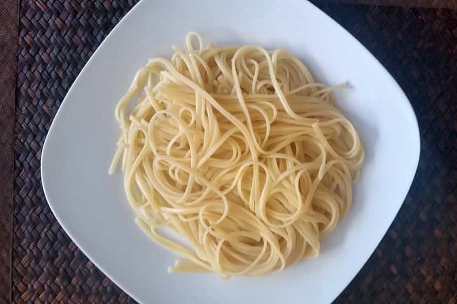 Mientras tanto, haz los fideos. Cocínalos según las instrucciones del paquete: en agua hervida con sal y aceite por 10 minutos aproximadamente. Una vez listos, escúrreles el agua.