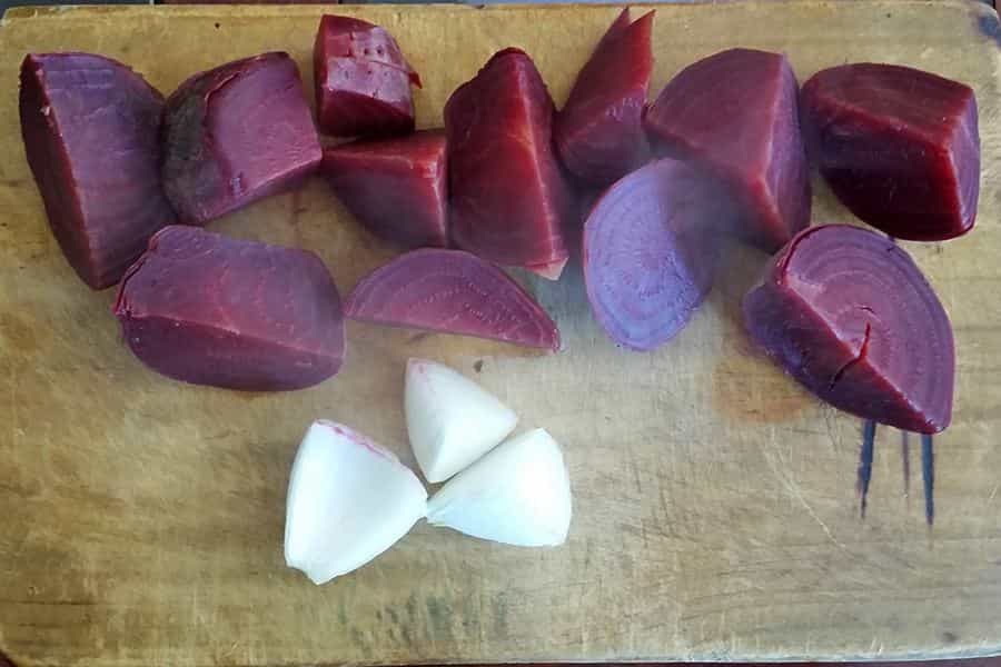 El primer paso es cocinar las betarragas. Primero hazlo en agua fría, y luego cócelas por 25 minutos desde que sueltan el primer hervor. Puedes comprobar que están cocidas, atravesando un cuchillo por una; debe deslizarse fácilmente. Cuando hayas hecho eso, déjalas enfriar.