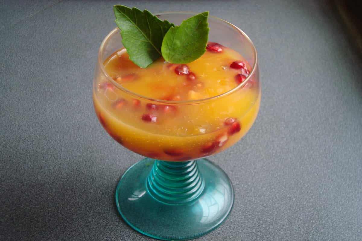 Dividir la granada en cuatro copas o pocillos y cuando la crema de naranja este entre tibia y fría, verterla en las copas. Refrigerar por 1 hora antes de servir.
