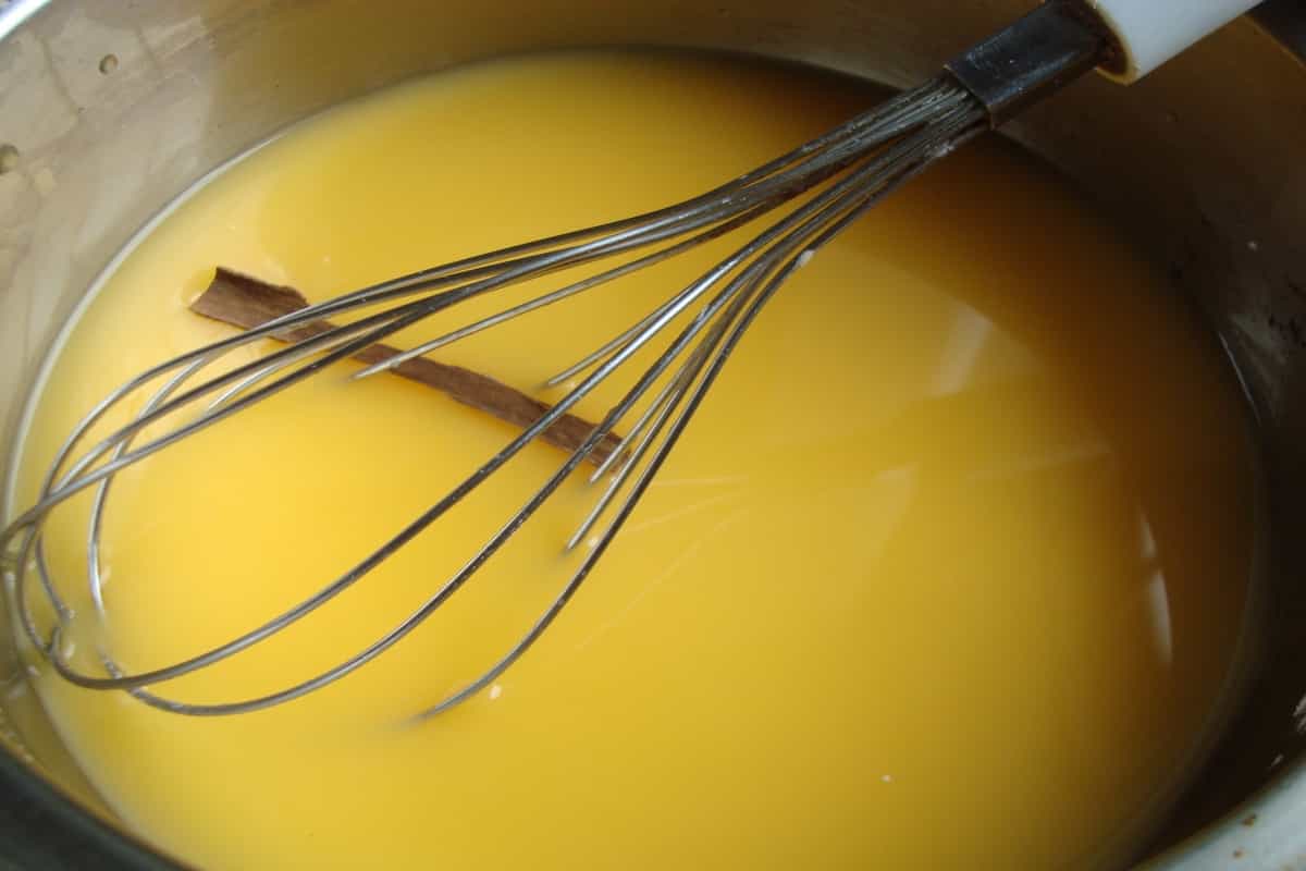 En una olla mezclar los huevos, azúcar, jugo de naranja, ralladura de naranja, ramita de canela y maicena. Con ayuda de un batidor manual (o un tenedor), revolver hasta integrar bien.
