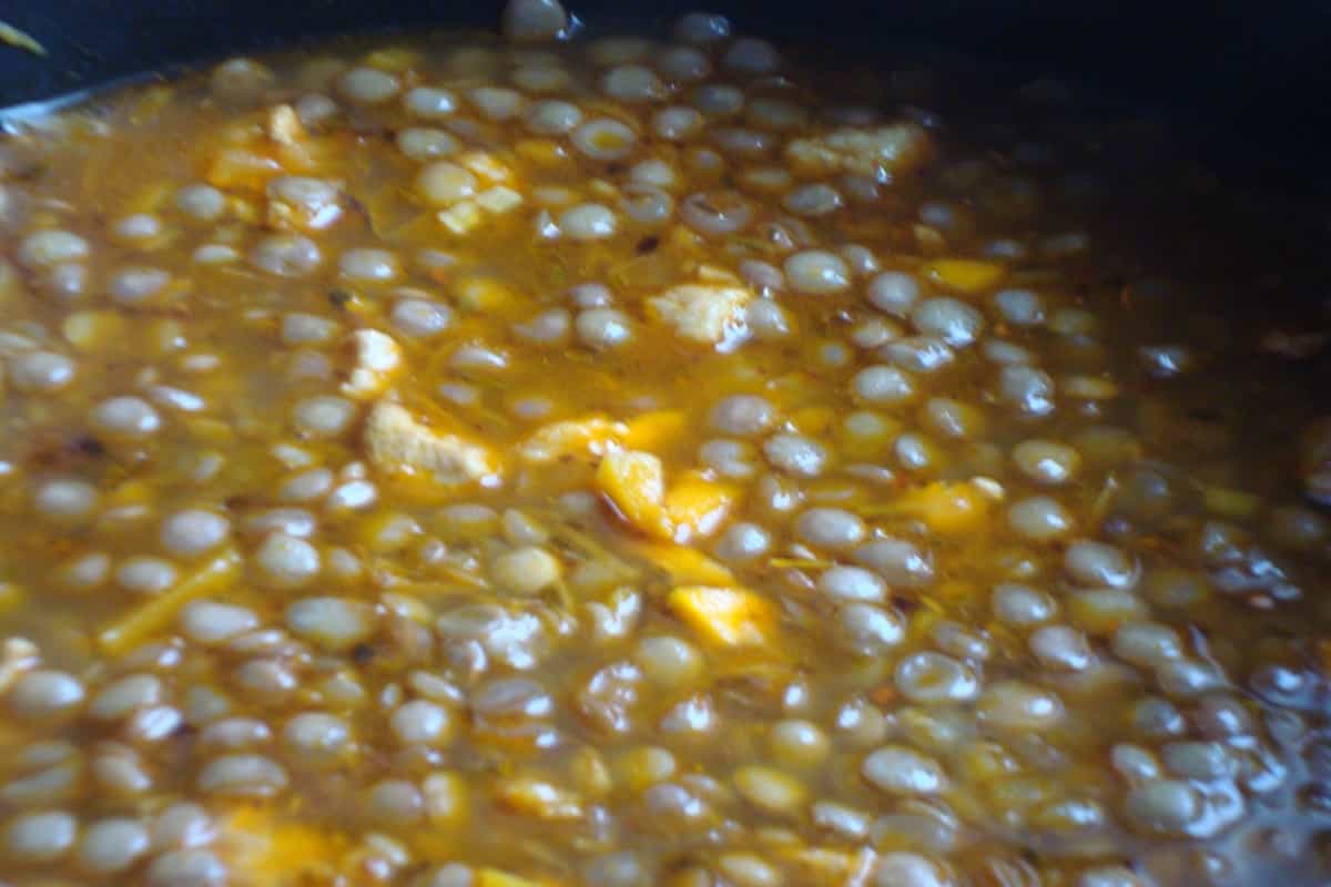 Agregar las lentejas, rectificar la sazón y cocinar hasta que la preparación hierva o hasta que la carne esté cocida. Apagar y servir. Espolvorear con cilantro fresco picado.