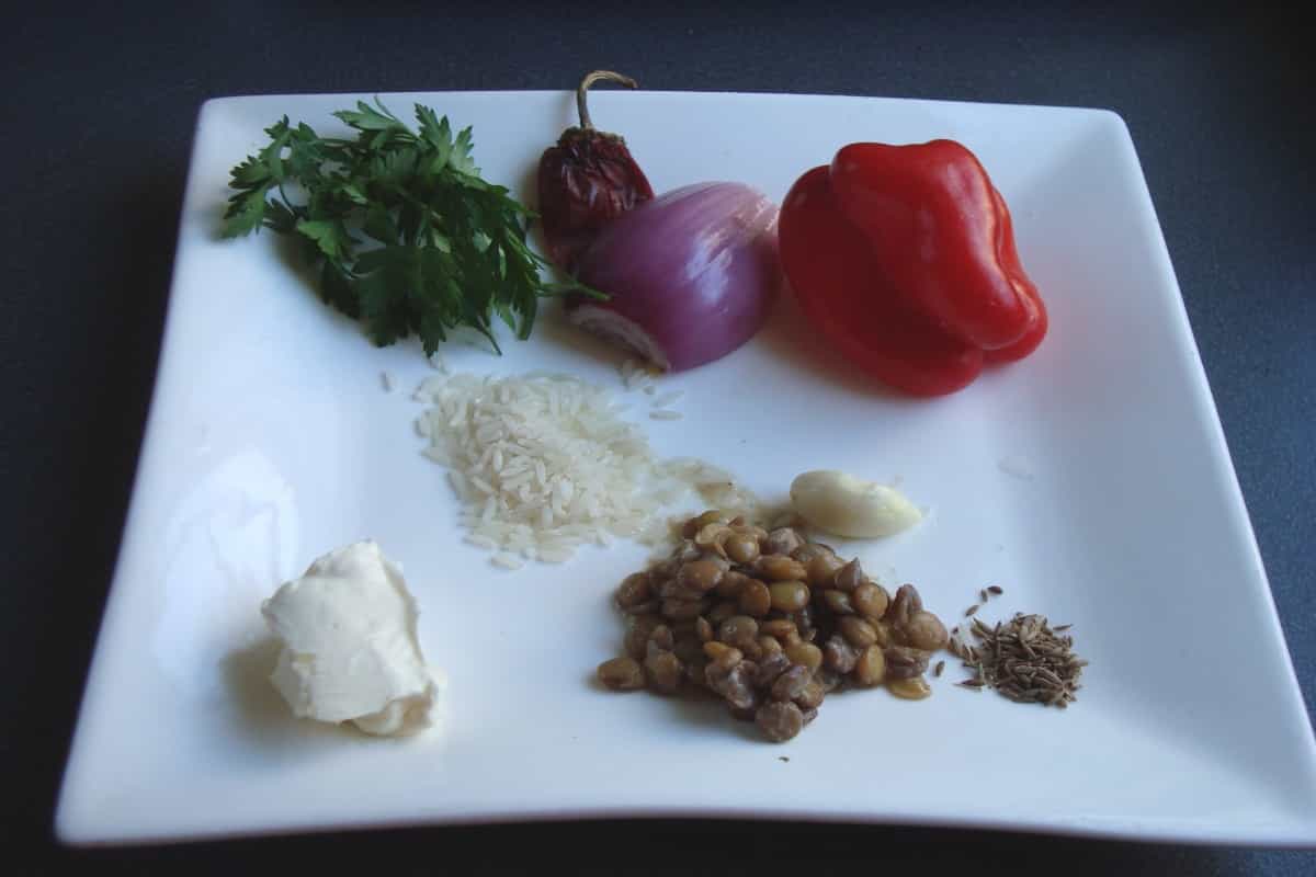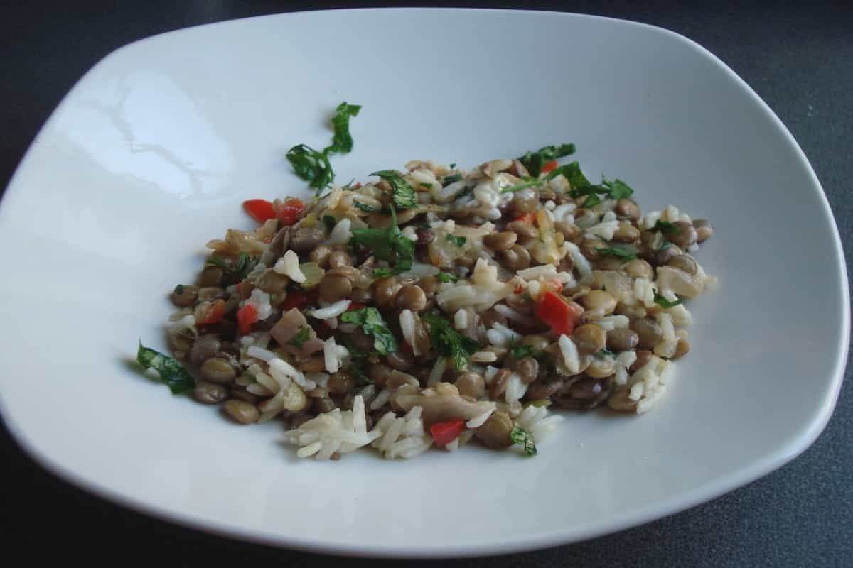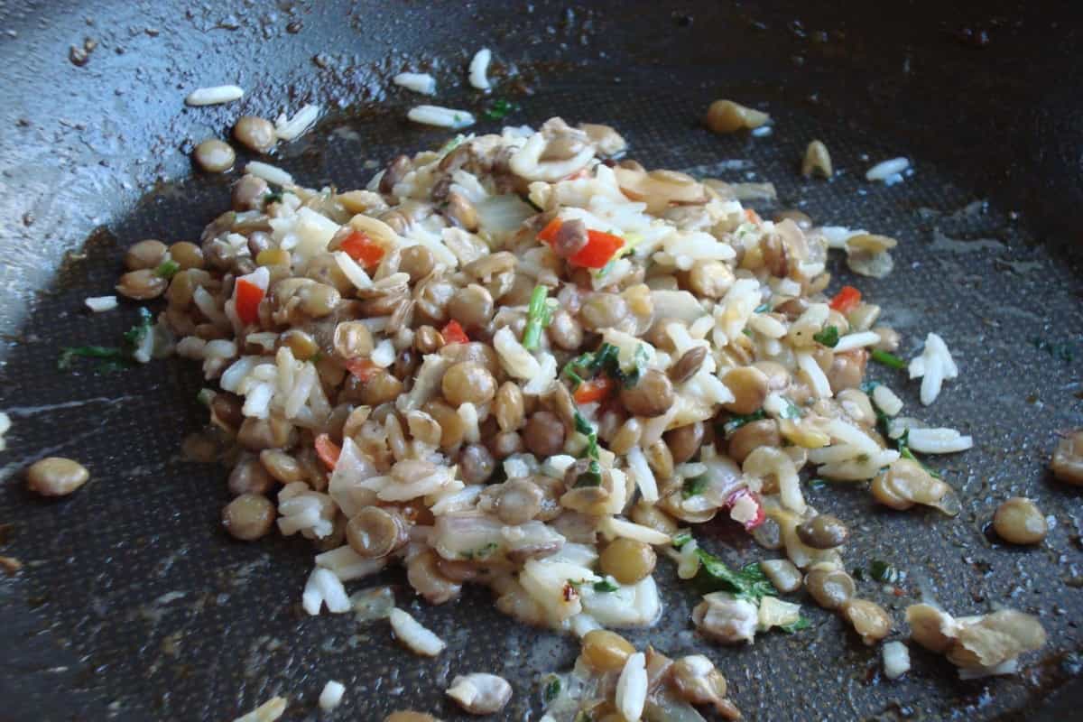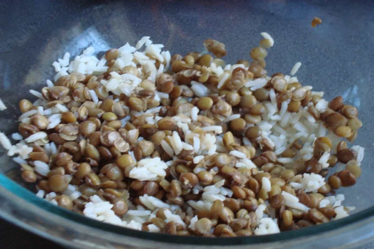 En un pocillo mezclar el arroz cocido y las lentejas, reservar.