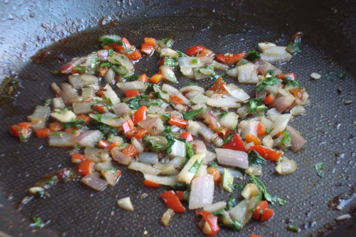 En un sartén con 2 cucharadas de aceite caliente, sofreír por 3 minutos a fuego medio la cebolla morada picada en cubos, el pimentón picado, los ajos, el ají, una cucharada de cilantro fresco, ají de color y sazonar con sal, pimienta y comino a gusto.