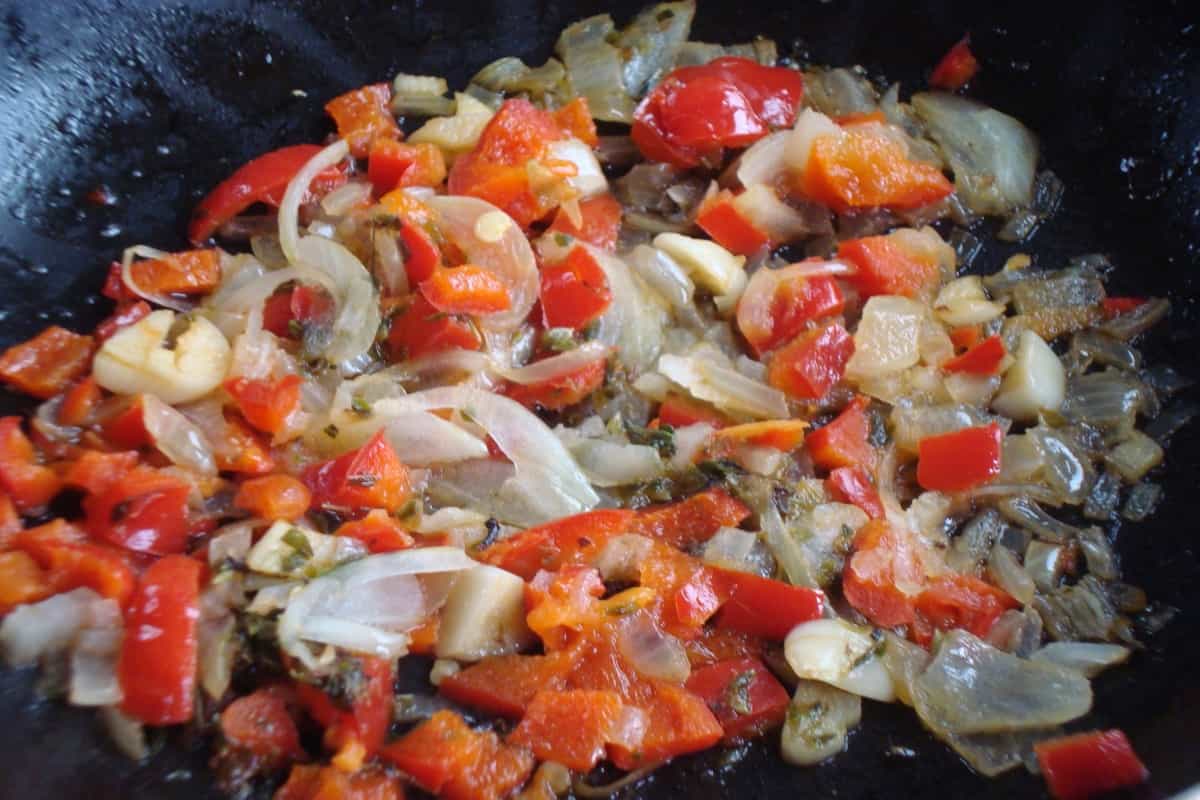 En un sartén con dos cucharadas de aceite de oliva caliente, saltear por 3 minutos la cebolla, pimentón y el ajo. Sazonar con sal, pimienta y orégano a gusto. Apagar y dejar enfriar.