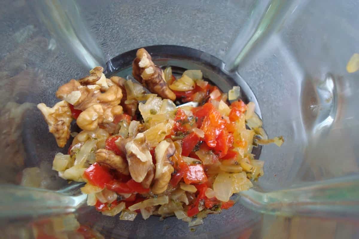 Poner en una procesadora o una juguera el sofrito de verduras, las nueces y la crema. Moler hasta obtener una crema homogénea.