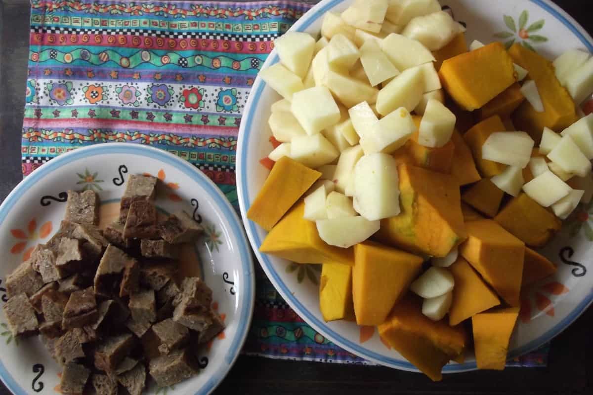 1. Cortar el zapallo, el seitán y las papas en trozos pequeños/medianos.