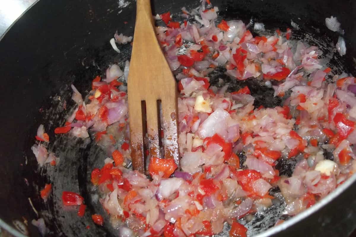 2. Hacer un sofrito con la cebolla, el pimentón y el ajo en la olla.