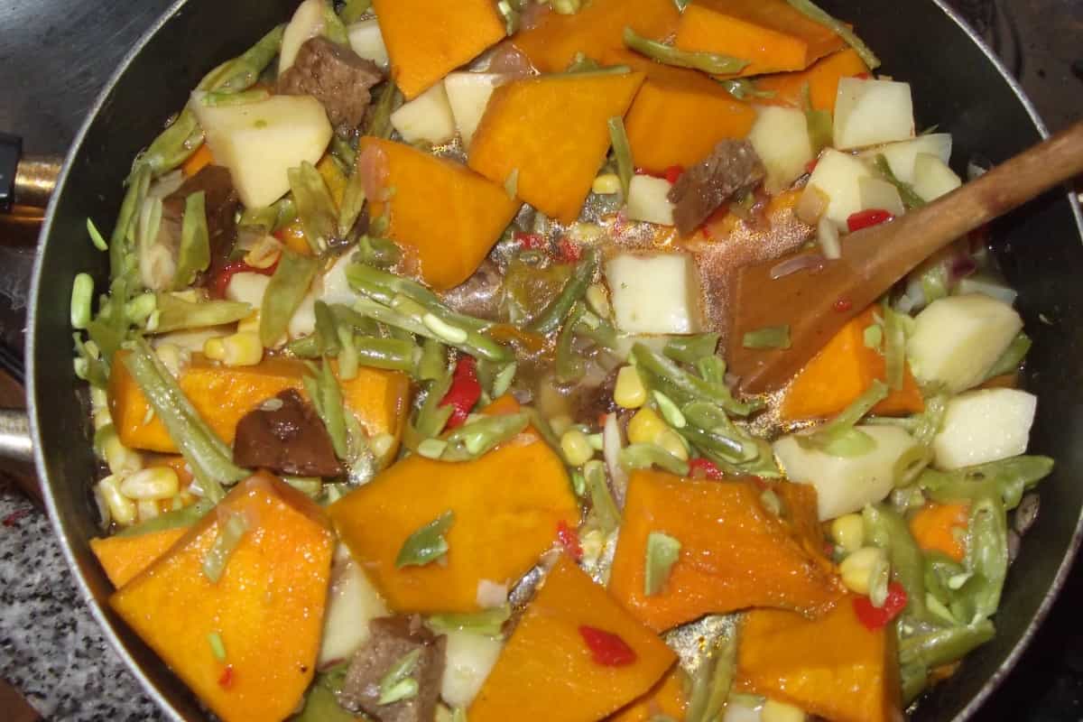 4. Luego, incorporar el zapallo, las papas, el choclo y los porotos verdes y agregar agua.