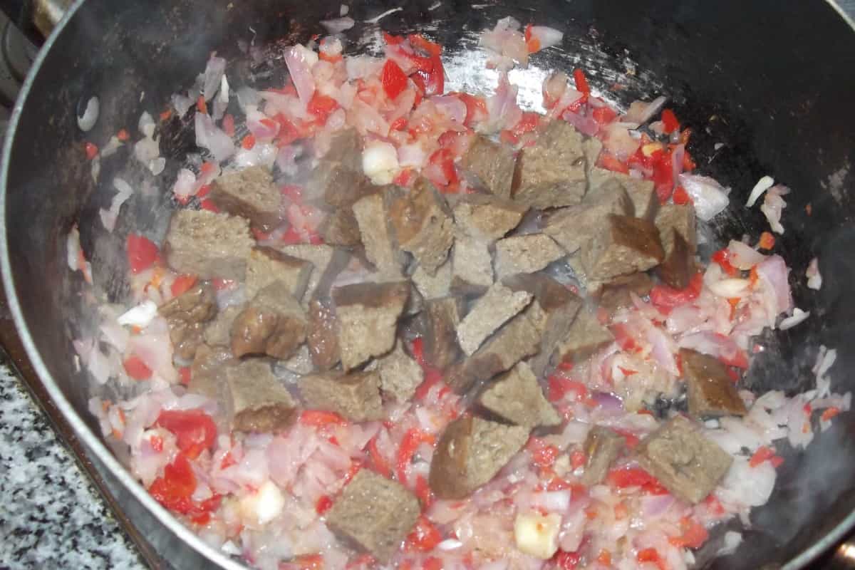 3. Cuando la cebolla esté transparente, añadir el seitán y dorar.