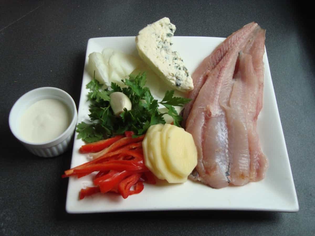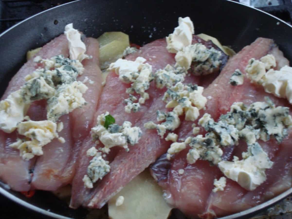 Finalmente, sobre la merluza distribuir trozos de mantequilla y el queso roquefort (puede ser picado, en trozos pequeños o rallado).