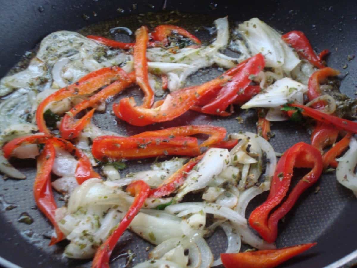 En un sartén con dos cucharadas de aceite caliente, saltear a fuego medio por dos minutos las verduras picadas (cebolla, pimentón y ajo). Sazonar con sal, pimienta y orégano a gusto.