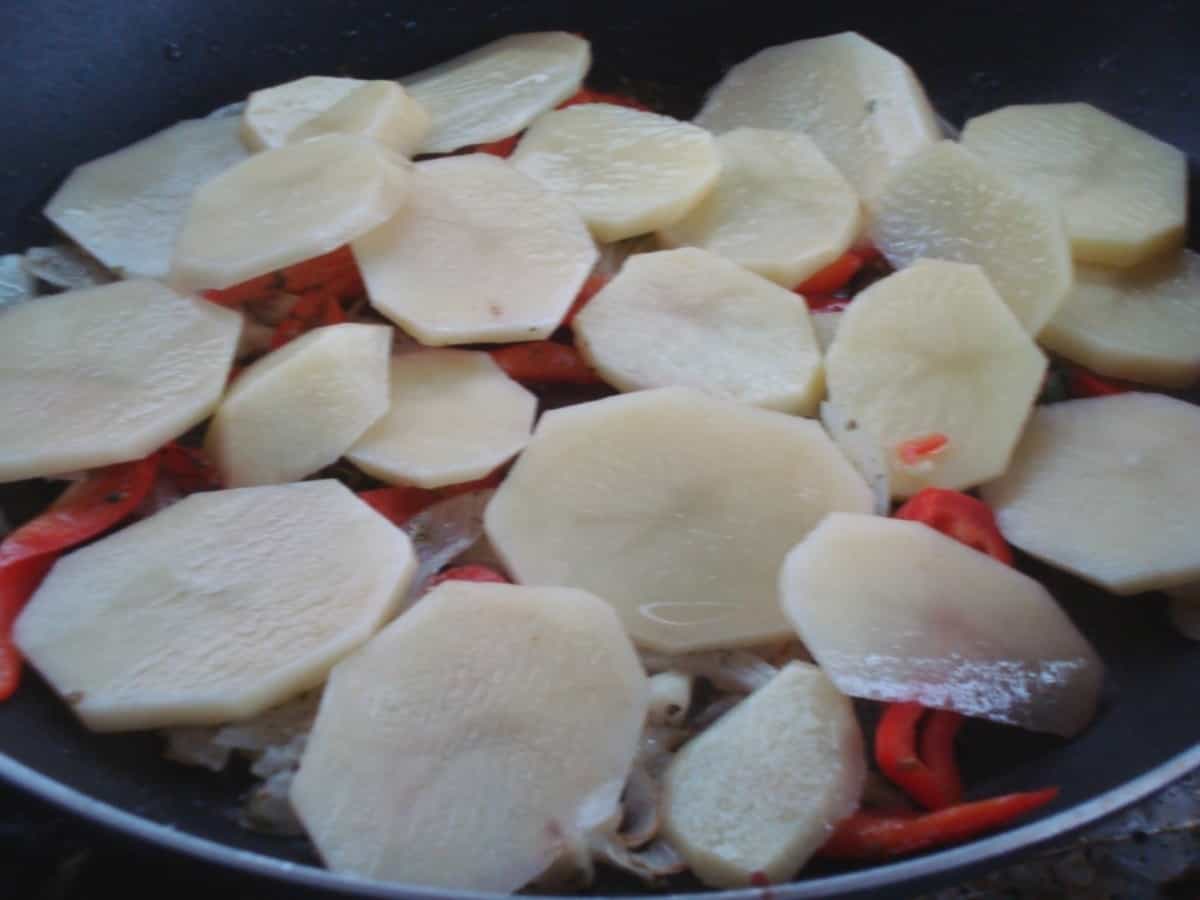 Distribuir el sofrito en una fuente apta para horno. Colocar encima una capa de papas peladas y cortadas en rodajas.
