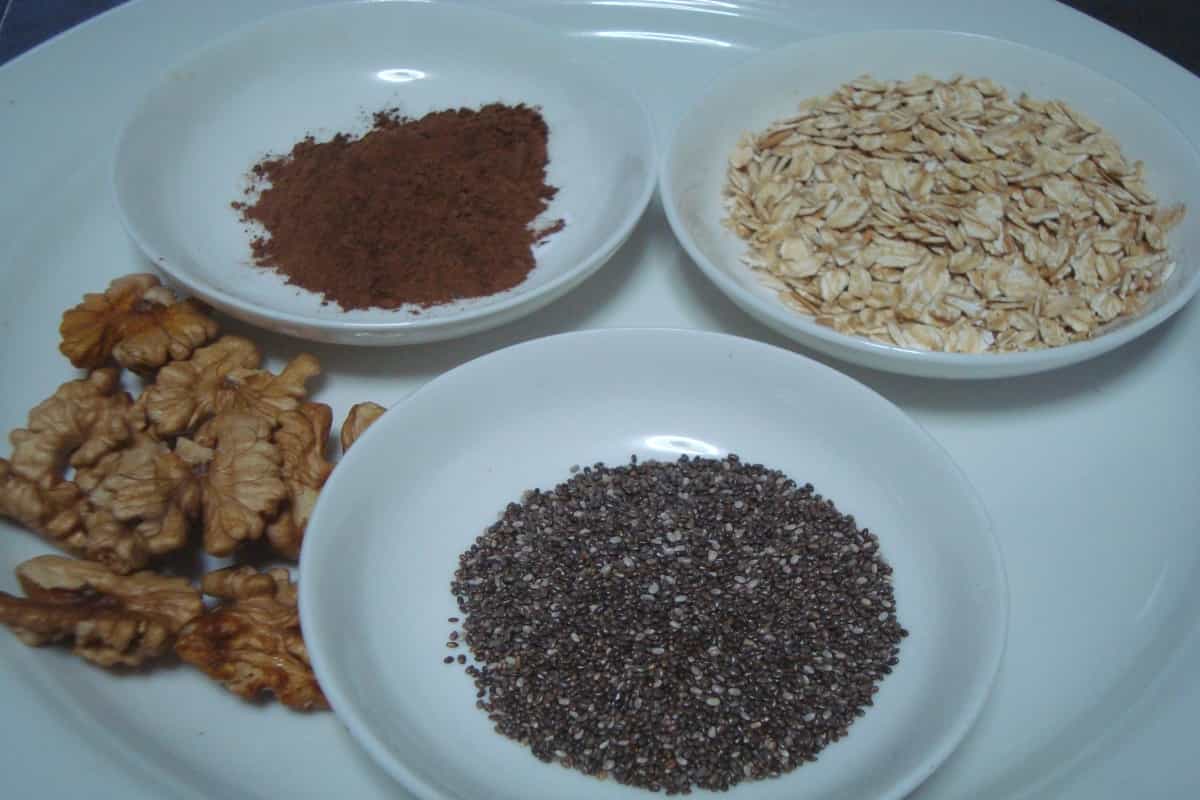 En un recipiente, mezclar la chía remojada, avena en polvo, chocolate o cacao en polvo, los frutos secos picados y el endulzante. Integrar bien hasta conseguir una especie de arenado. En este momento puedes agregar pasas o cranberry a gusto.