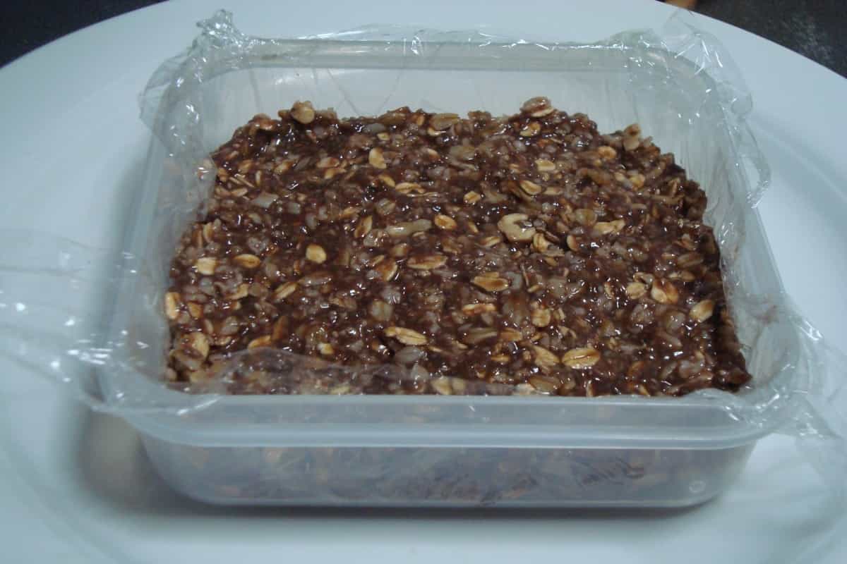 Forrar un pote (puede ser de plástico, vidrio o de aluminio) con papel alusa plas, verter la preparación y apretar para que la mezcla se compacte. Refrigerar por 30 minutos. Desmoldar y cortar las porciones dependiendo del tamaño que quieras para la barra.