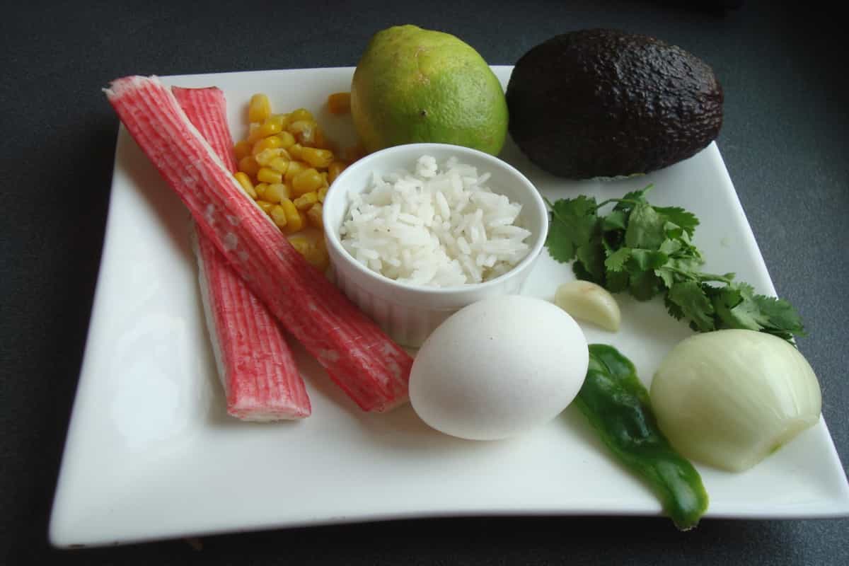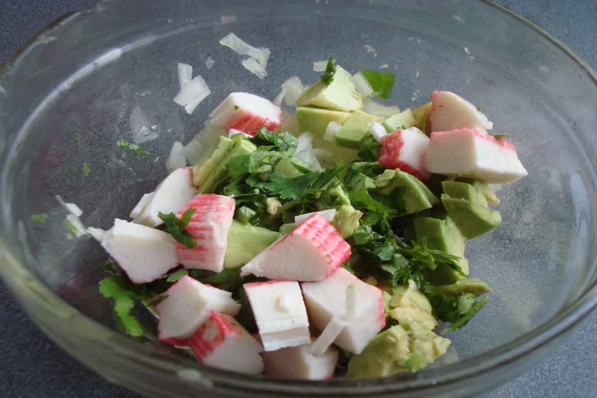 En un recipiente mezclar el kanikama cocido y cortado en trozos, cebolla picada, pimentón en cubos pequeños, ajo picado, cilantro, paltas peladas sin carozo y cortadas en cubos. Por último añadir el jugo de 1 limón. Reservar.