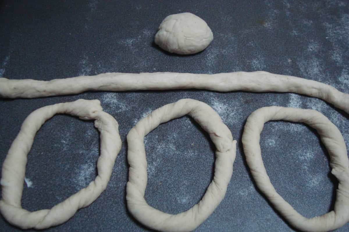 Transcurrido el tiempo de reposo, volcar la masa a una mesa enharinada y dividirla en 8 porciones, formando con cada trozo una tira. Enroscarla y cerrar las puntas.