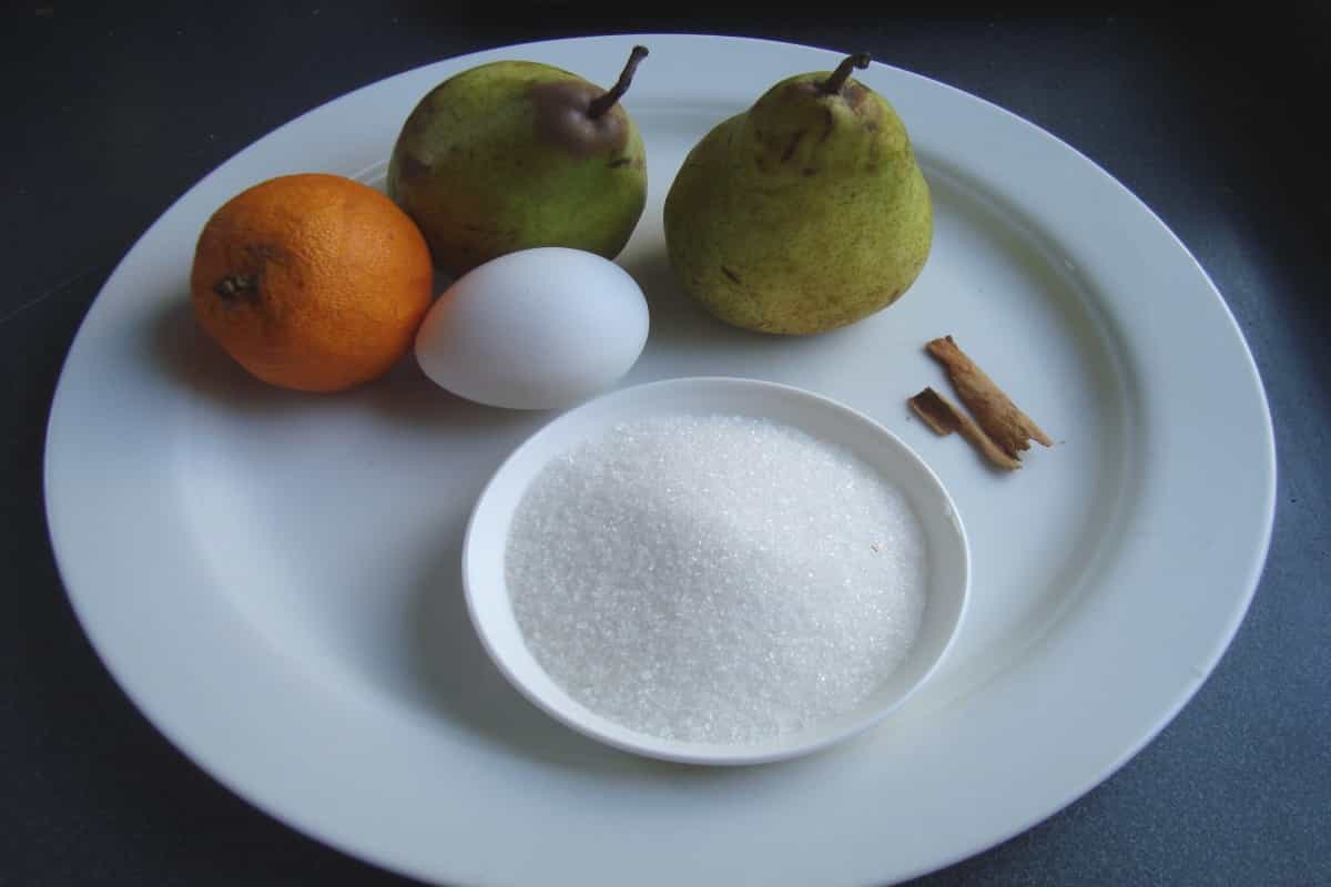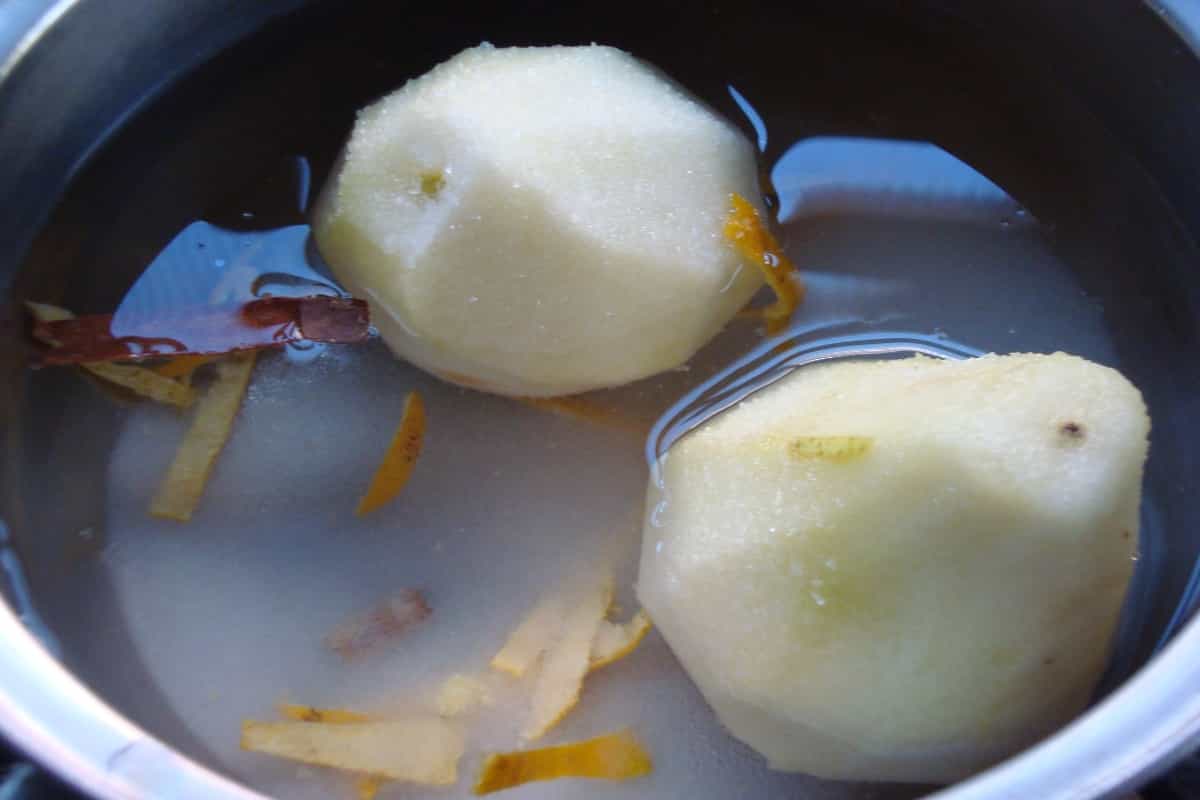 Pelar las peras y ponerlas en una olla con 4 tazas de agua y 2 cucharadas de azúcar. Cocinar por 10 minutos. Transcurrido el tiempo de cocción, mide 2 tazas del jugo de la cocción, añade 2 cucharadas de azúcar, las cáscaras de naranja y la canela, hiérvelo durante 5 minutos y agrega las peras.