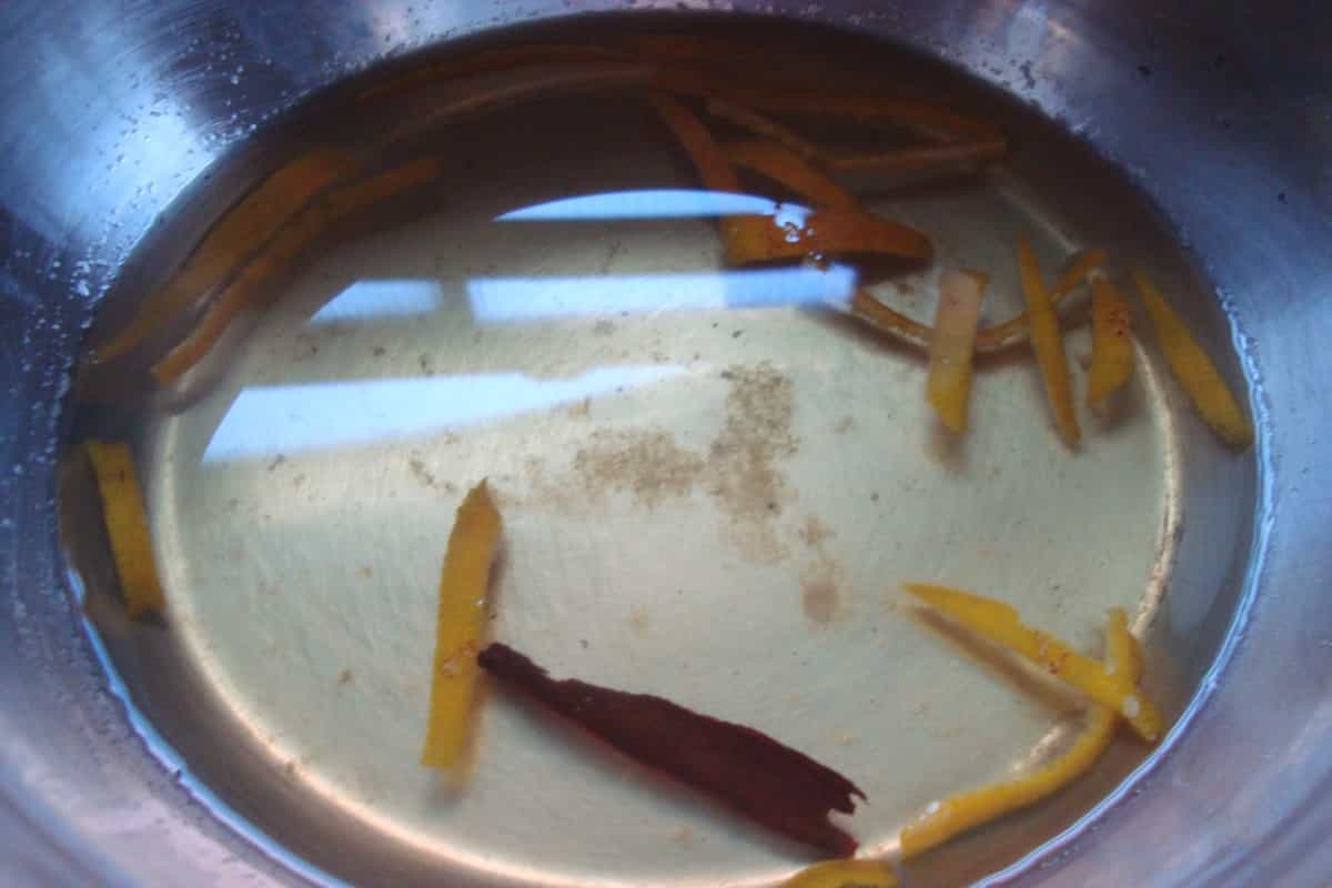 Pelar la naranja, retirar la parte blanca de la cáscara, cortarla en tiras finas.