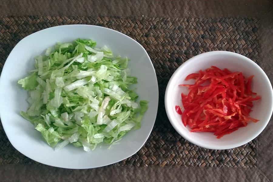 Para preparar esta receta, lo primero es trabajar con las verduras. Lava y pica la lechuga junto con el pimentón, en tiritas finas.