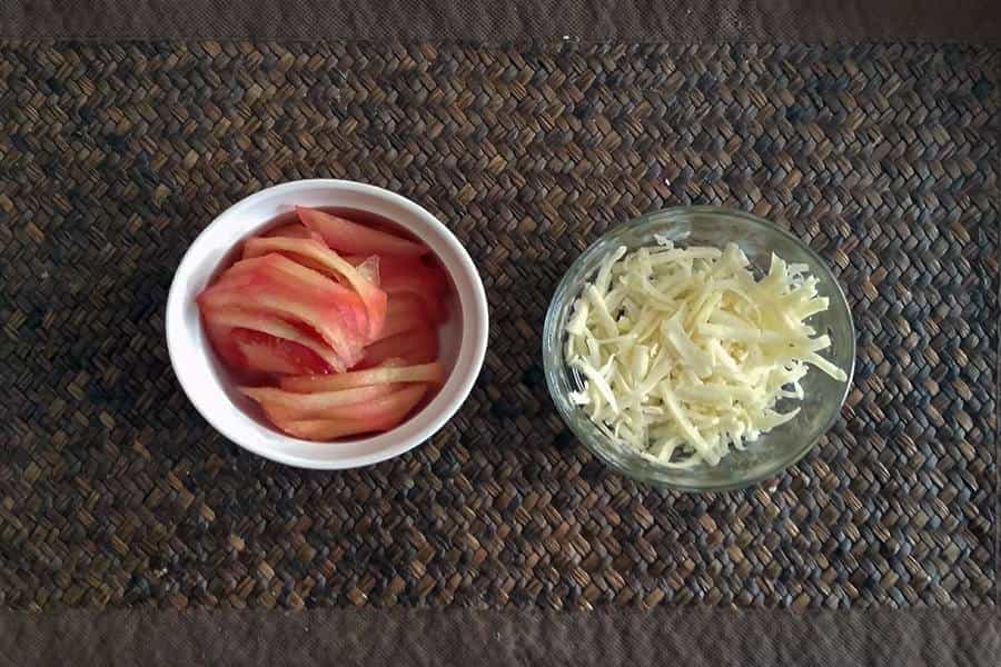 Después corta los tomates en rodajas o cuadros, y ralla el trozo de queso. Apenas lo hagas, incorpóralos a la ensalada, cuidando revolver hasta que se integren bien.