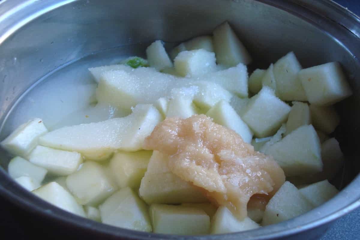 Pelar las manzanas, eliminar las pepas y picarlas en cubos pequeños. Cocinarlas en una olla con 1 taza de agua, 4 cucharadas de jugo de limón, ½ taza de azúcar y miel. Cocinar a fuego alto durante 8 minutos.
