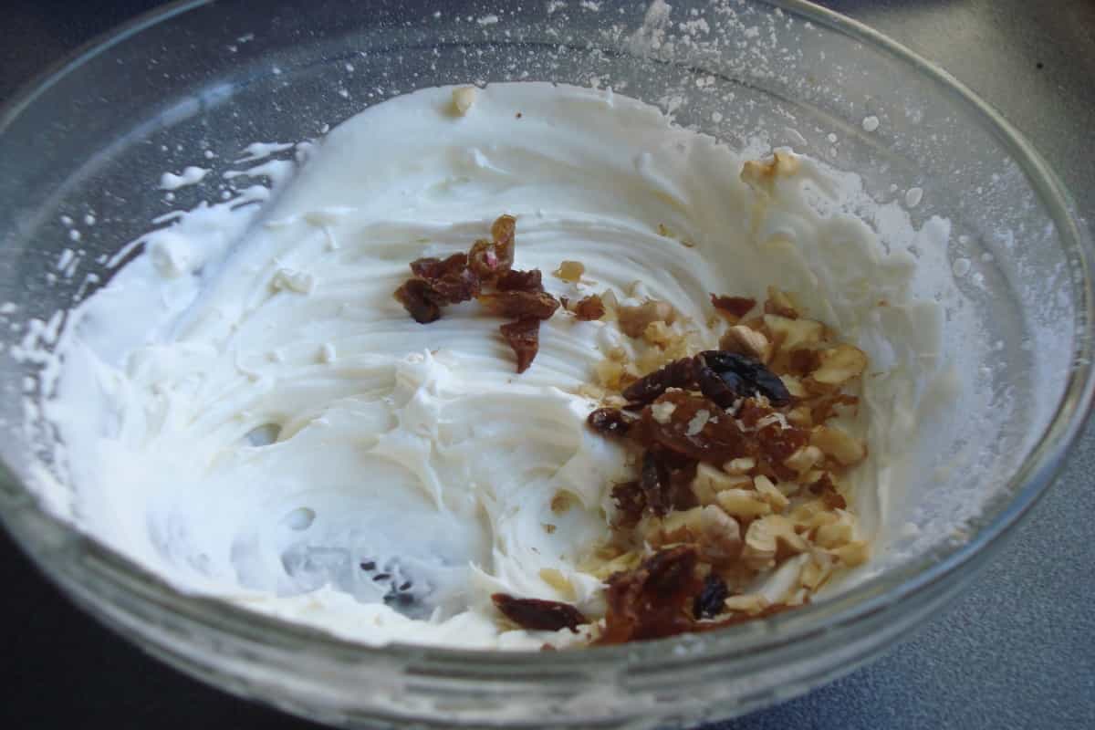 En un pocillo batir la crema, incorporando poco a poco el azúcar flor. Cuando la crema haya tomado una consistencia un tanto espesa, dejar de batir, añadir las nueces y las pasas picadas (reservar un poco para adornar). Con ayuda de una cuchara de madera, integrar con suaves movimientos envolventes.