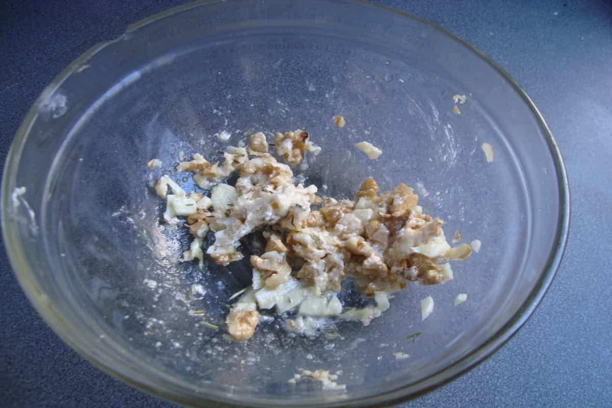 En un recipiente, mezclar queso rallado, ajo picado, queso crema y nueces picadas, formando una pasta.
