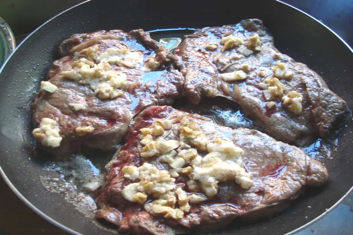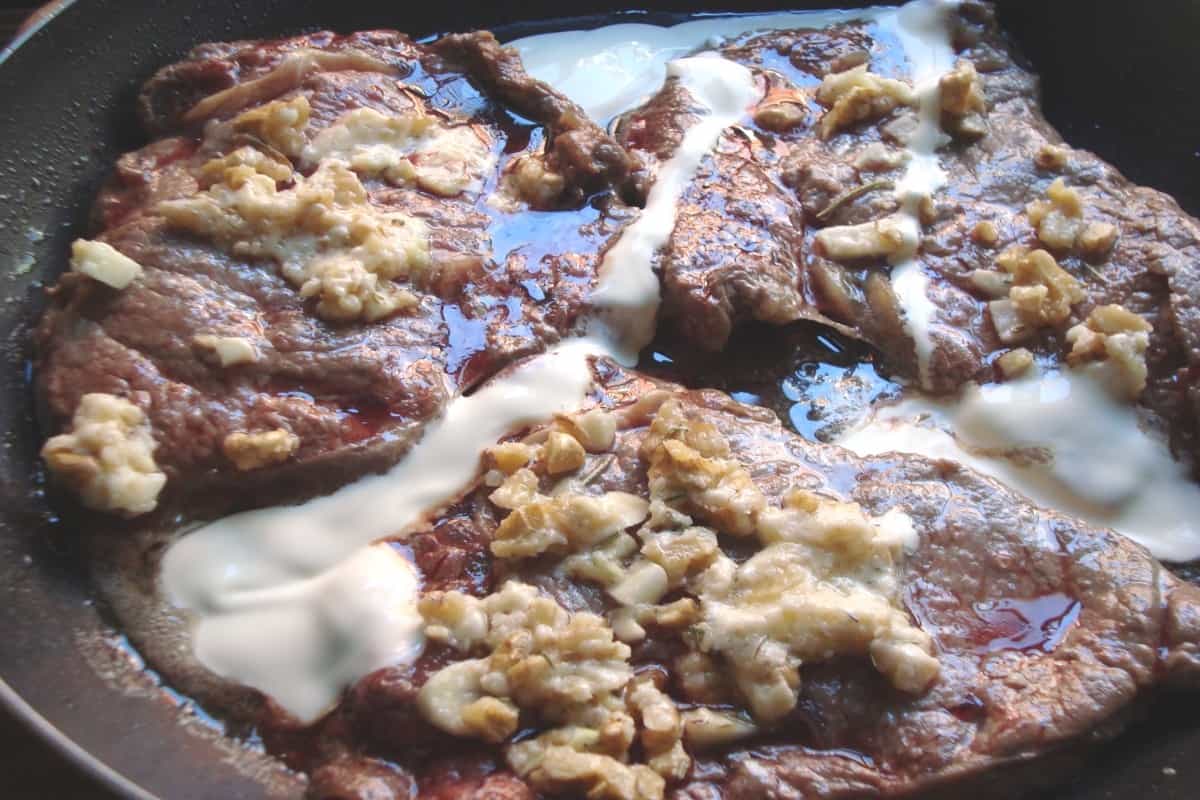 En un sartén con aceite caliente, sellar los trozos de lomo salpimentados (deben quedar dorados por fuera, pero crudos por dentro). Cubrir cada trozo de lomo con la pasta de nueces y queso, cocinando por 2 minutos.