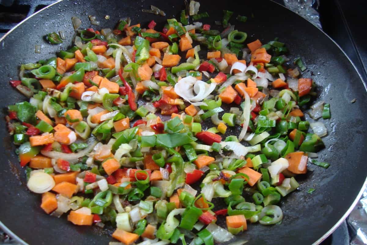 En el mismo sartén, sofreír la cebolla picada en cubos pequeños. Cocinar a fuego bajo hasta que esté transparente, incorporando la zanahoria picada en cubos pequeños. Mantener en el fuego por 5 minutos, añadir los pimentones y el cebollín picado (si fuese necesario, puedes ir incorporando pequeñas cantidades de aceite de oliva). Sazonar a gusto y revolver suavemente, cocinando a fuego bajo por 15 minutos.