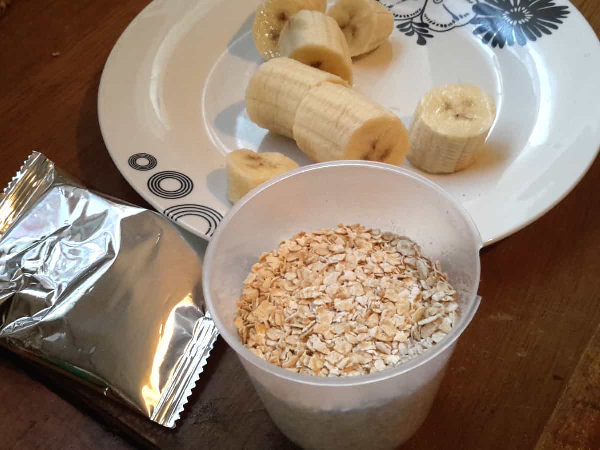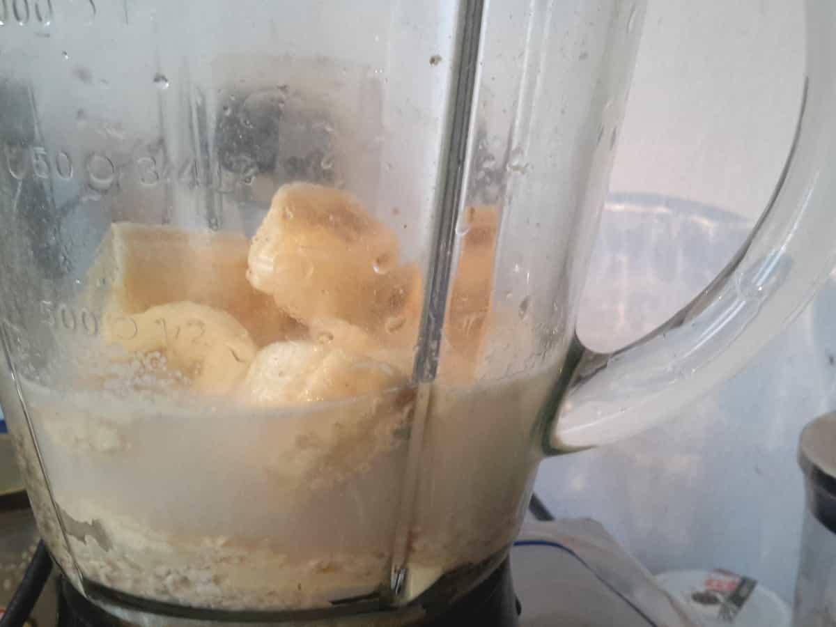 Pon todos los ingredientes en la licuadora. Como usé leche de soja en polvo, la puse en la licuadora y agregué una taza de agua.