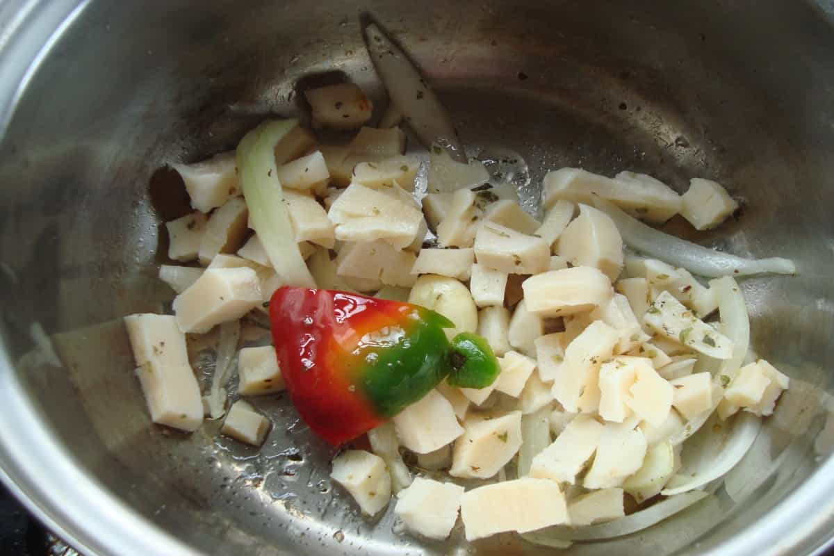 En una olla con 1 cucharada de aceite caliente, sofreír por 2 minutos la cebolla picada en pluma, el trozo entero de pimentón y los dientes de ajo. Sazonar con orégano, pimienta y sal a gusto. (Debes tener en cuenta que la jibia, al igual que todos los alimentos que provienen del mar, ya son un poco salados). Incorporar los cubos de jibia, revolver y cocinar por 2 minutos más.