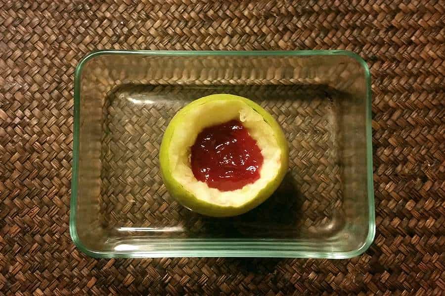 Lo que sigue es preparar el relleno base de las manzanas. El método que usaremos es en capas, así que en cada fruta, pon una capa de azúcar flor y una de mermelada. Listo eso, coloca las manzanas en una fuente para horno, y hornéalas por 10 minutos.