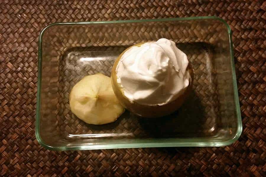 ¿Y ahora? Sólo disfrutar, pues tu manzana asada rellena de merengue está lista. Si gustas, puedes decorarla con chispitas de chocolates o de colores. Se verá apetitosa.
