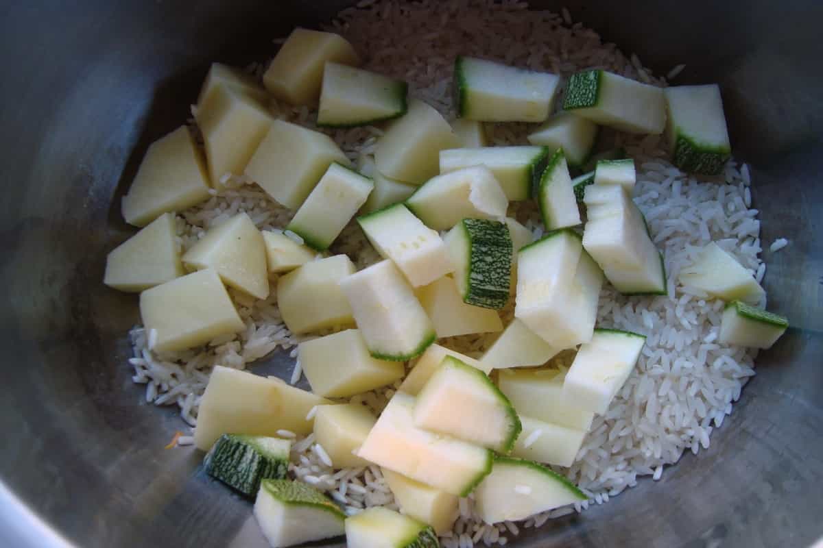 En una olla con 2 cucharadas de aceite de oliva caliente, saltear a fuego medio por 3 minutos la cebolla picada en cubos pequeños. Incorporar un diente de ajo picado, un zapallo italiano picado en cubos, una papa picada y el arroz, revolver, sazonar con sal de mar y merquén a gusto y cocinar por 2 minutos.