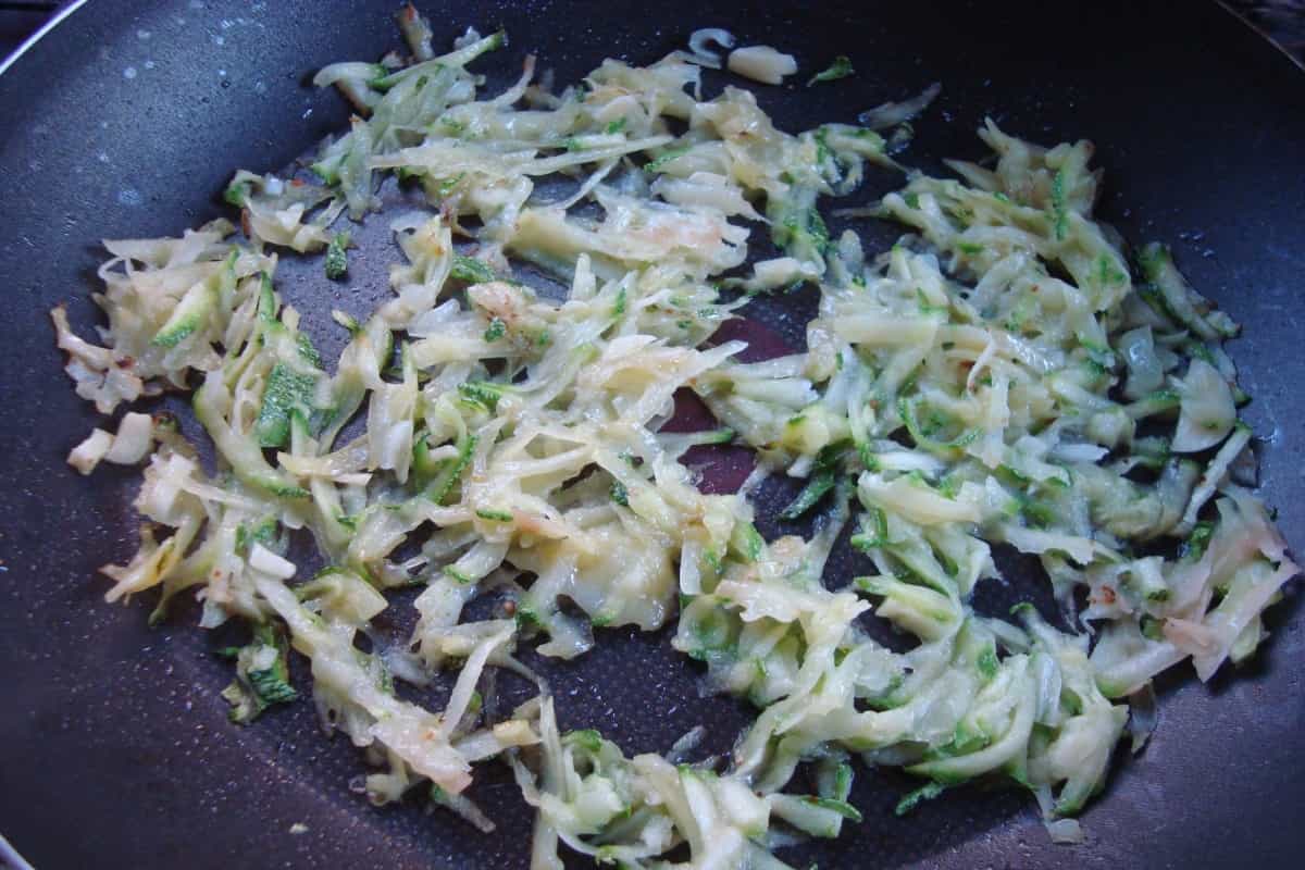 En un sartén con 2 cucharadas de mantequilla derretida, sofreír a fuego medio por 2 minutos un zapallo italiano rallado y una papa rallada. Sazonar a gusto.