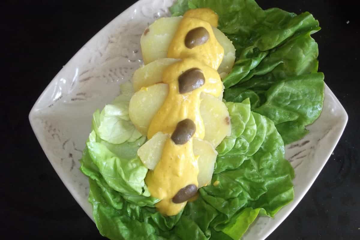 4. Cortar las papas en rodajas, y las aceitunas en mitades, sin cuesco. En un plato mediano, poner una hoja grande de lechuga y sobre ella las papas, la salsa y las aceitunas como decoración.