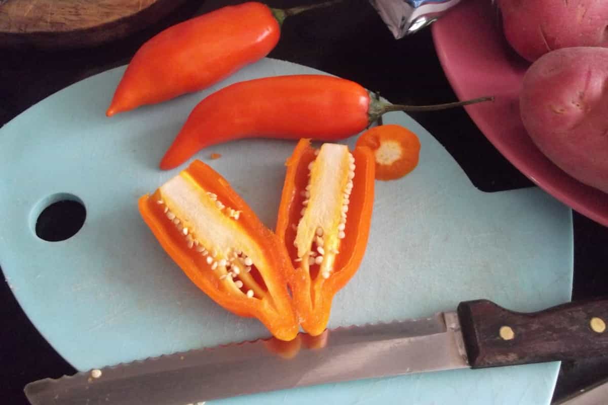 2. Mientras tanto, cortar los ajíes en mitades, cuidando sacar todas las pepas y "venas" (de lo contrario, la salsa quedará muy picante).